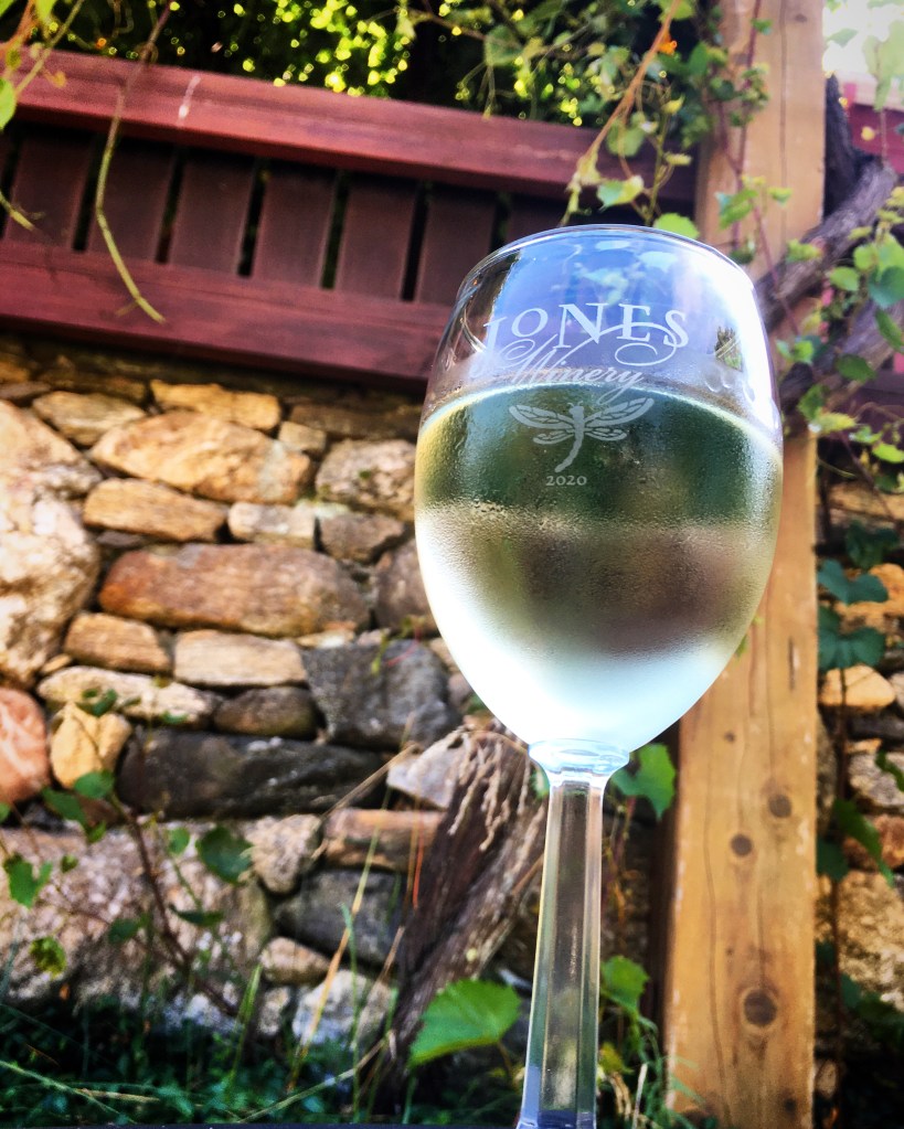 It was a beautiful, sunny day with temperatures in the mid 90s, and a quick google search brought up a place that was open on a Sunday afternoon: Jones Family Farms and Winery. Their website said that it was reservations only, but the reservation platform wouldn’t load on my phone so I decided to just risk being a walk up – normally not a problem, but in the midst of Covid…They have distancing measures in place and can accommodate less than half their normal capacity. However, I was in luck and they had some free overflow tables available.Â