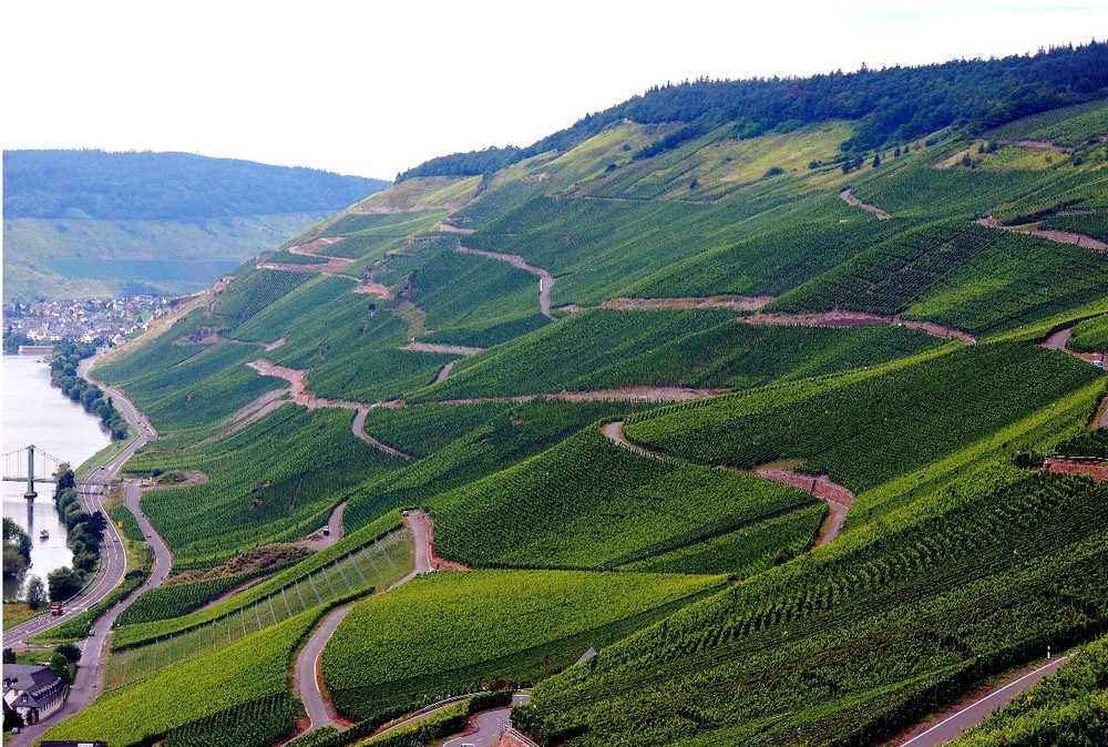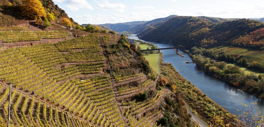 It has a cool, Continental climate and the best vineyard sites are located on steep slopes along the river, to benefit from the reflected sunlight and heat. These slate soiled slopes typically have a 30° angle, although Bremmer Calmont holds the world record for steepest vineyard with a staggering 65° incline! Working these slopes is difficult and dangerous, and it’s practically impossible for any sort of machinery to be utilized; most work is done by hand, with workers often being tied for safety. Vines are individually staked into the ground and connected by wires, so that workers can work horizontally rather than vertically. While safety is paramount, there have been fatalities working these treacherous vineyard sites.