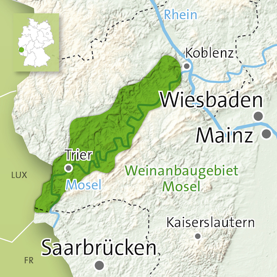 The Mosel region is located on the western border of Germany, above France and next to Luxembourg, and runs along the Mosel River for about 145 miles. Its wine-growing history dates back to Roman times, making it the oldest producing region in Germany.