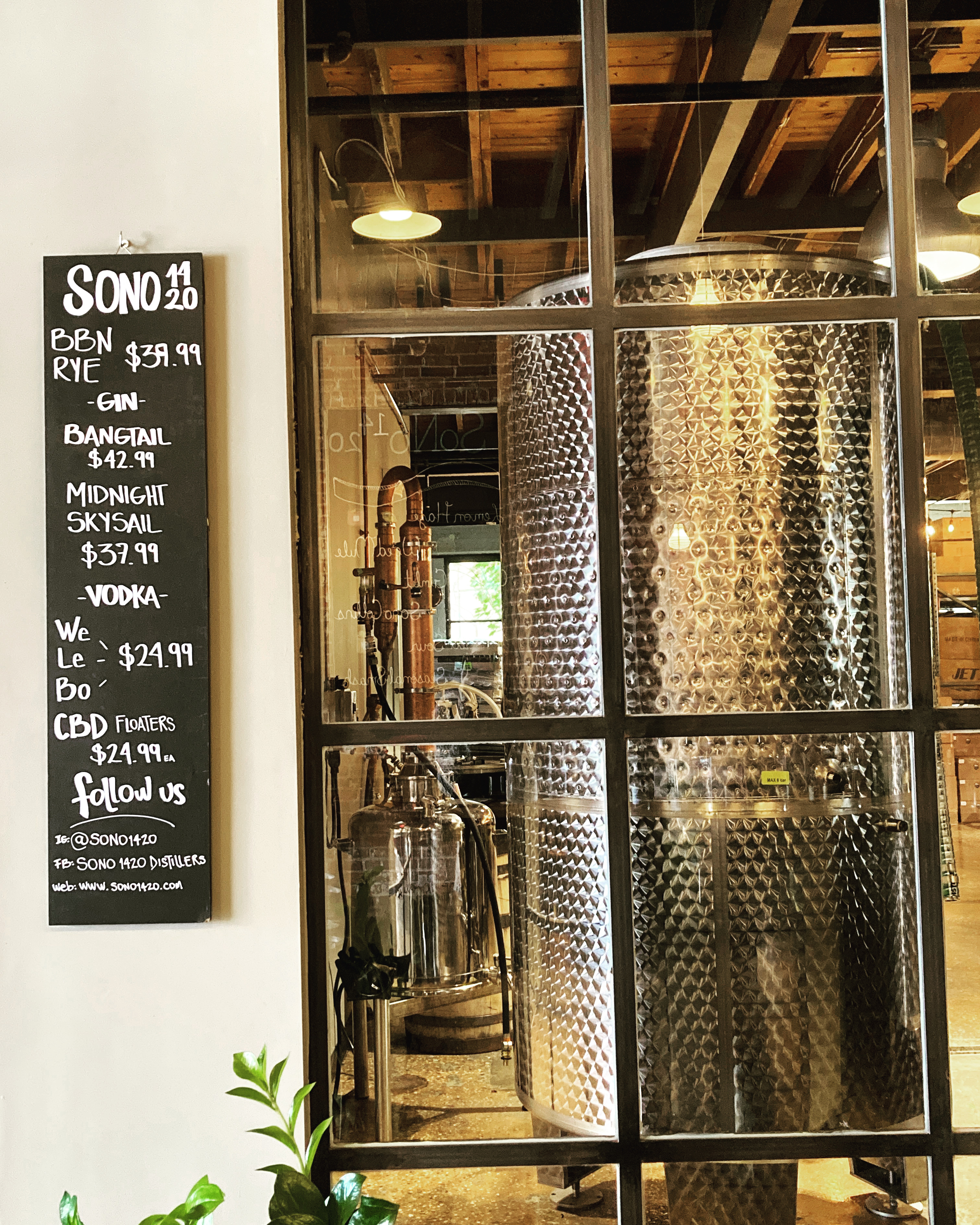 You can do a tasting flight or get some fabulous looking cocktails to drink there or to take away. Blake is their mixologist and a very lively fellow, fun to chat with and excellent with the drinks, of course! I chose the flight, which included a whiskey and their 3 gins (although you could sub out for their vodkas if desired).